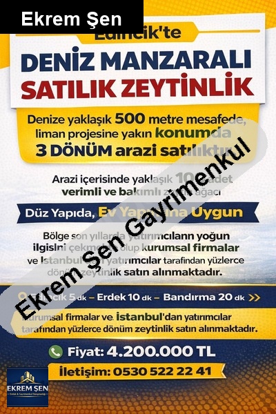yeni açılacak limana yakın denize 500 metre mesafede yakınında evler bulunan i̇çinde 100 adet zeytin ağacı bulunan arazisi düz zeytinlik satılıktır içine ev yapılabilir